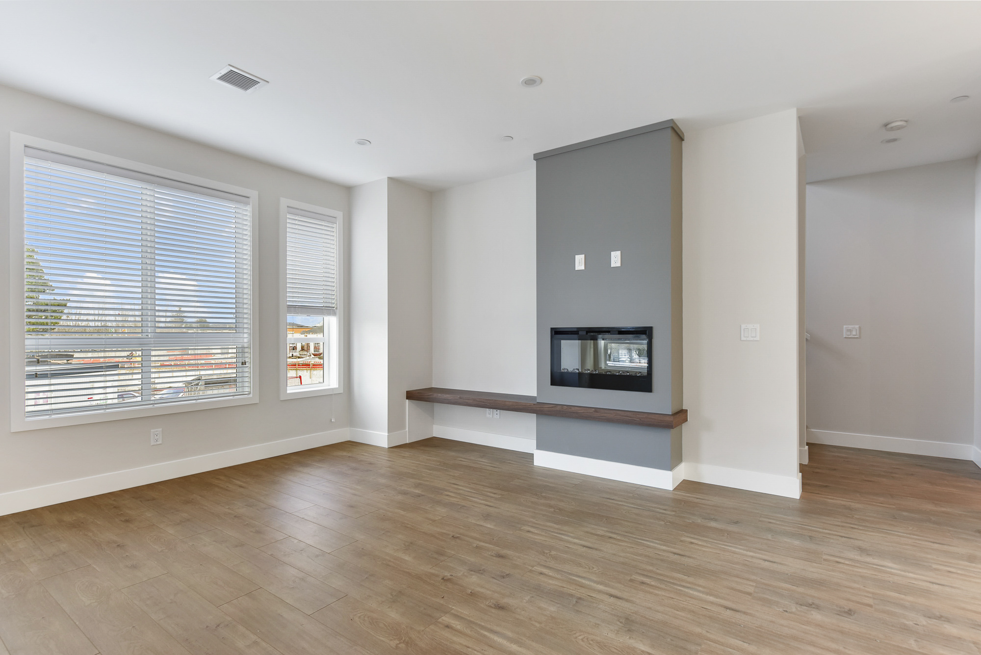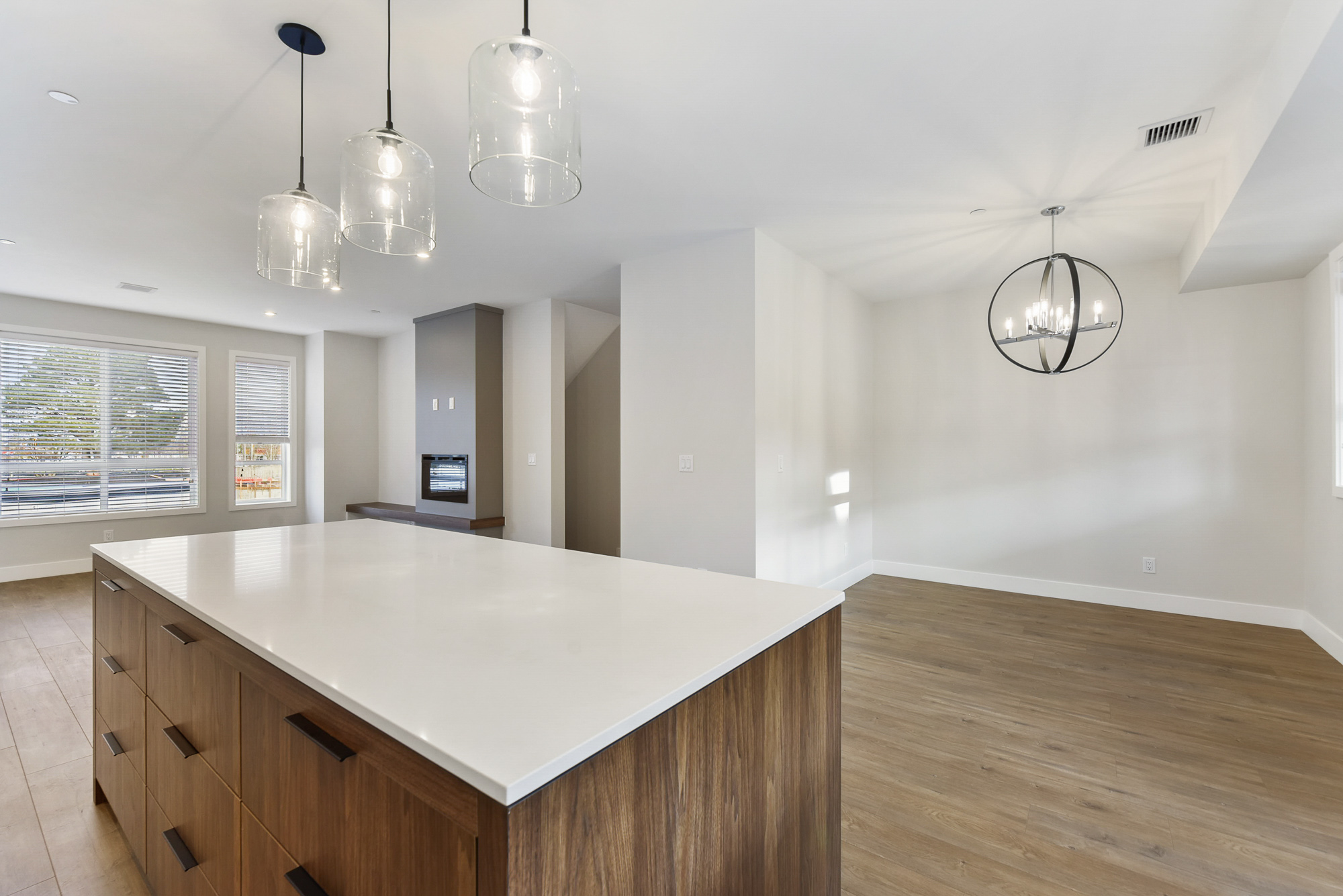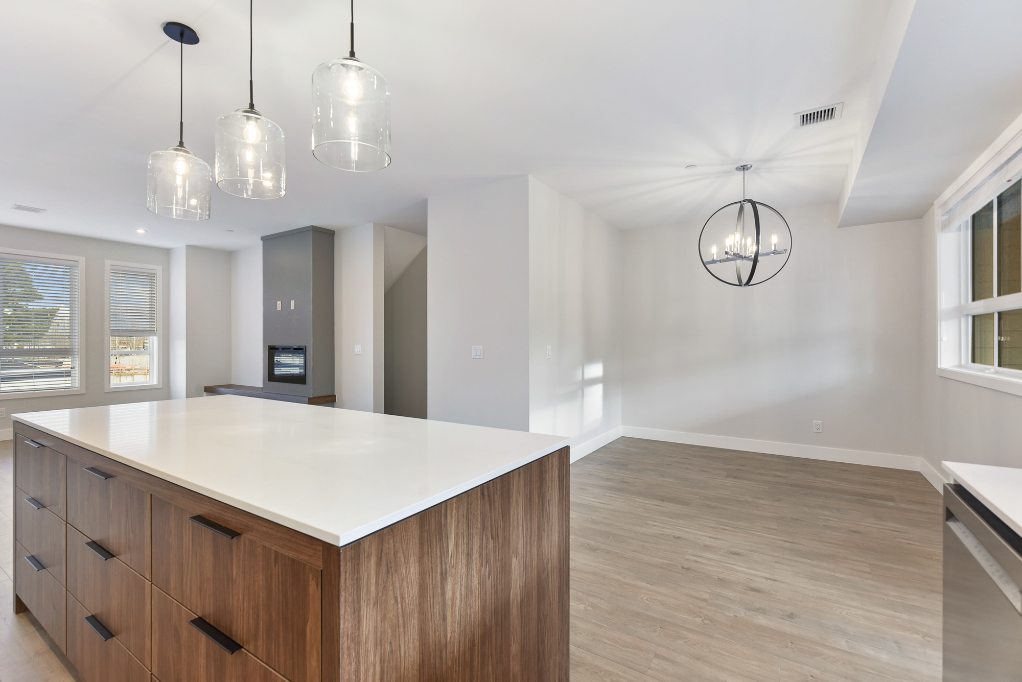 At the heart of the home is a bright, inviting kitchen featuring a custom island, upgraded gas appliances, quartz countertops, warm wood accents, and sleek matte-black hardware—perfect for everyday family living or hosting friends. The living area is complete with an electric fireplace that adds a cozy touch year-round.