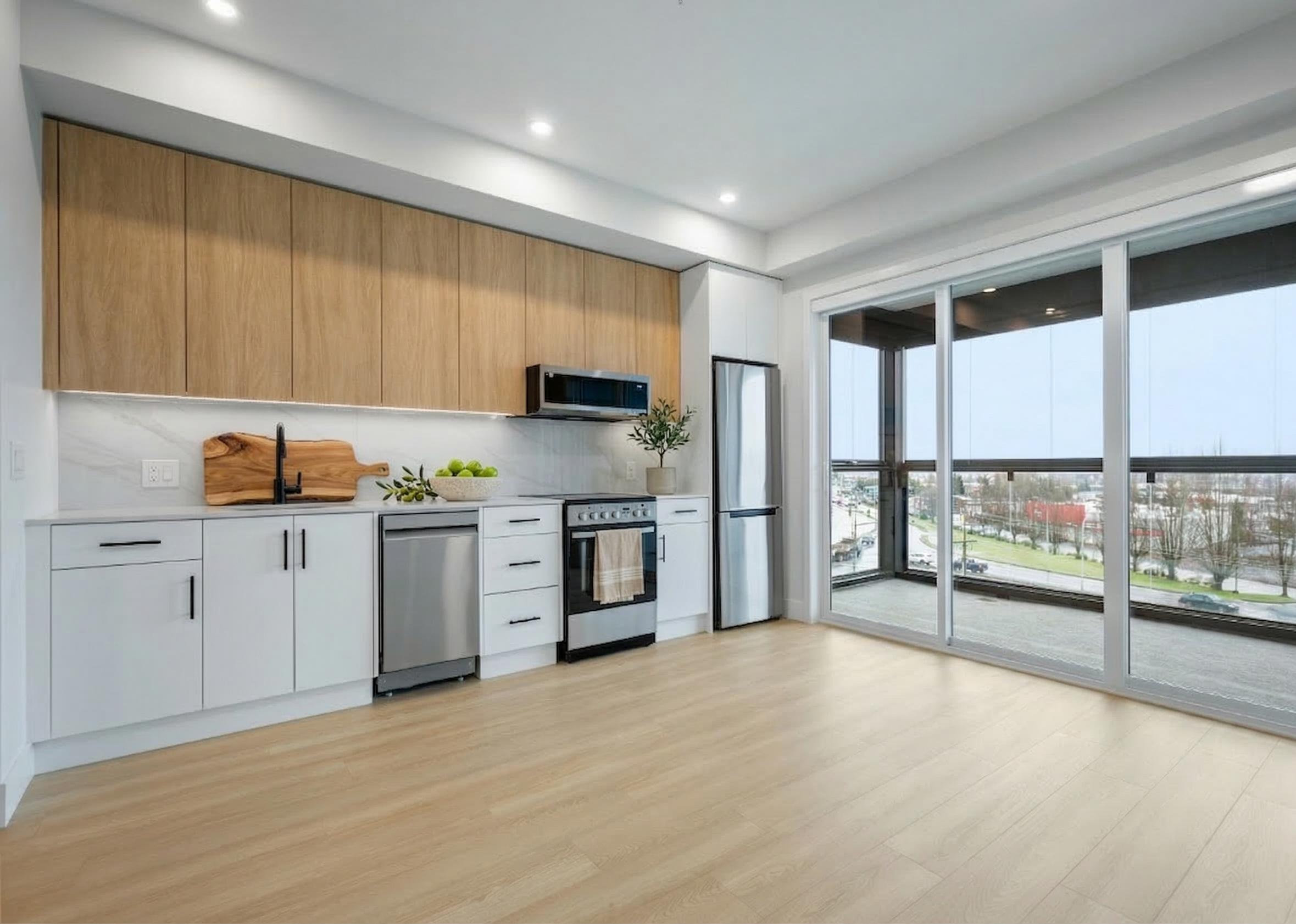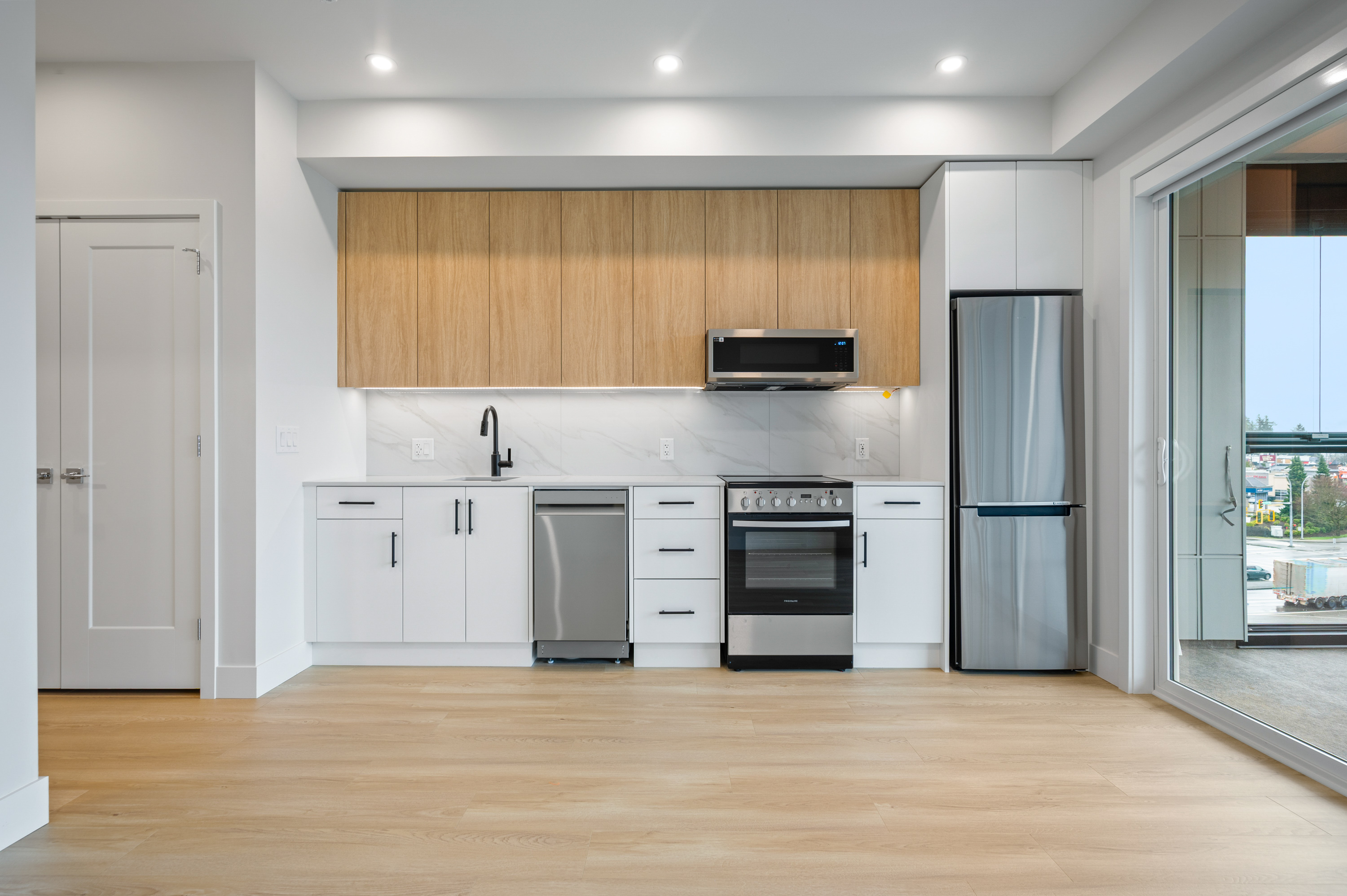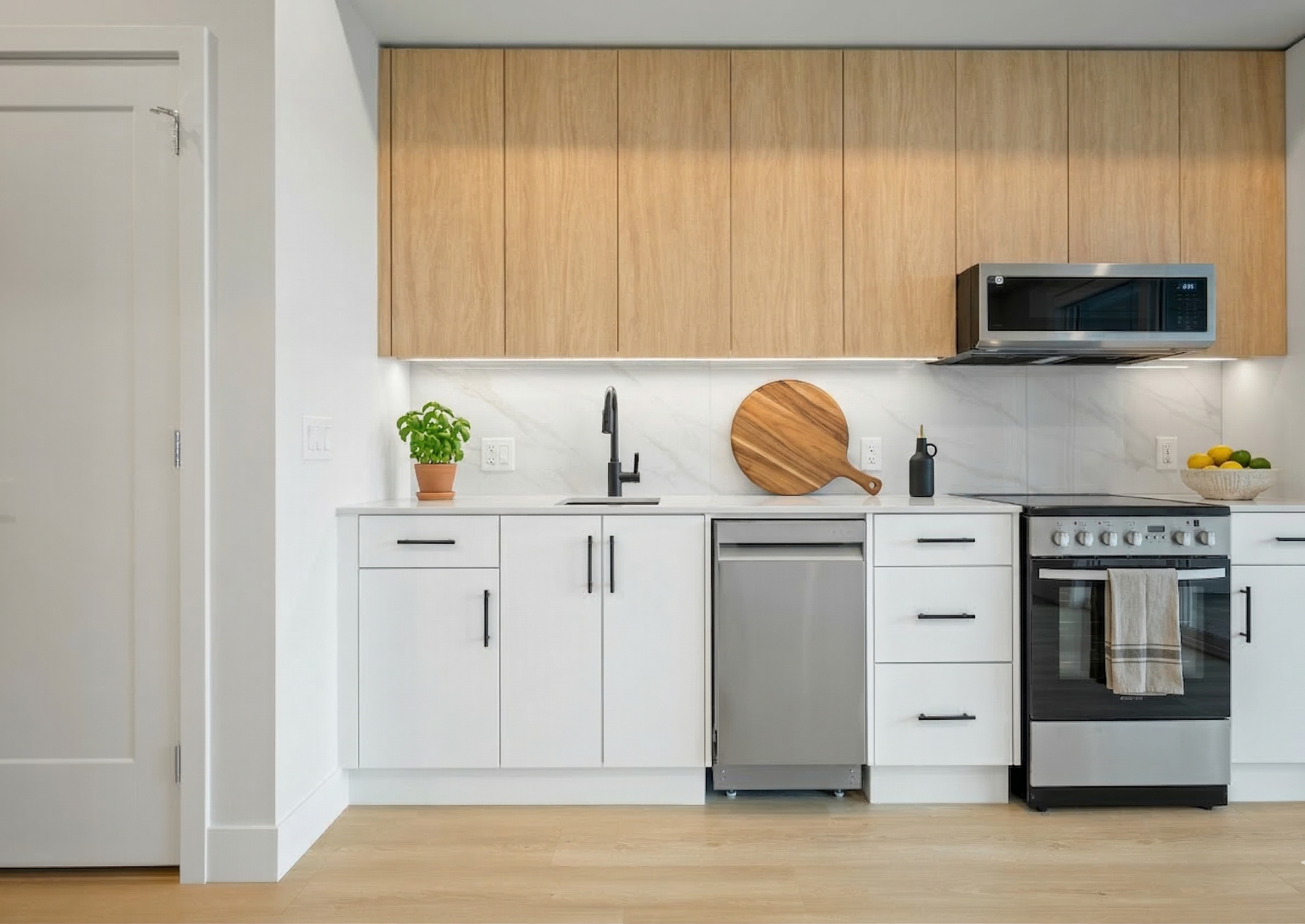 -Fresh white lower cabinets with complementary light oak laminate upper cabinets