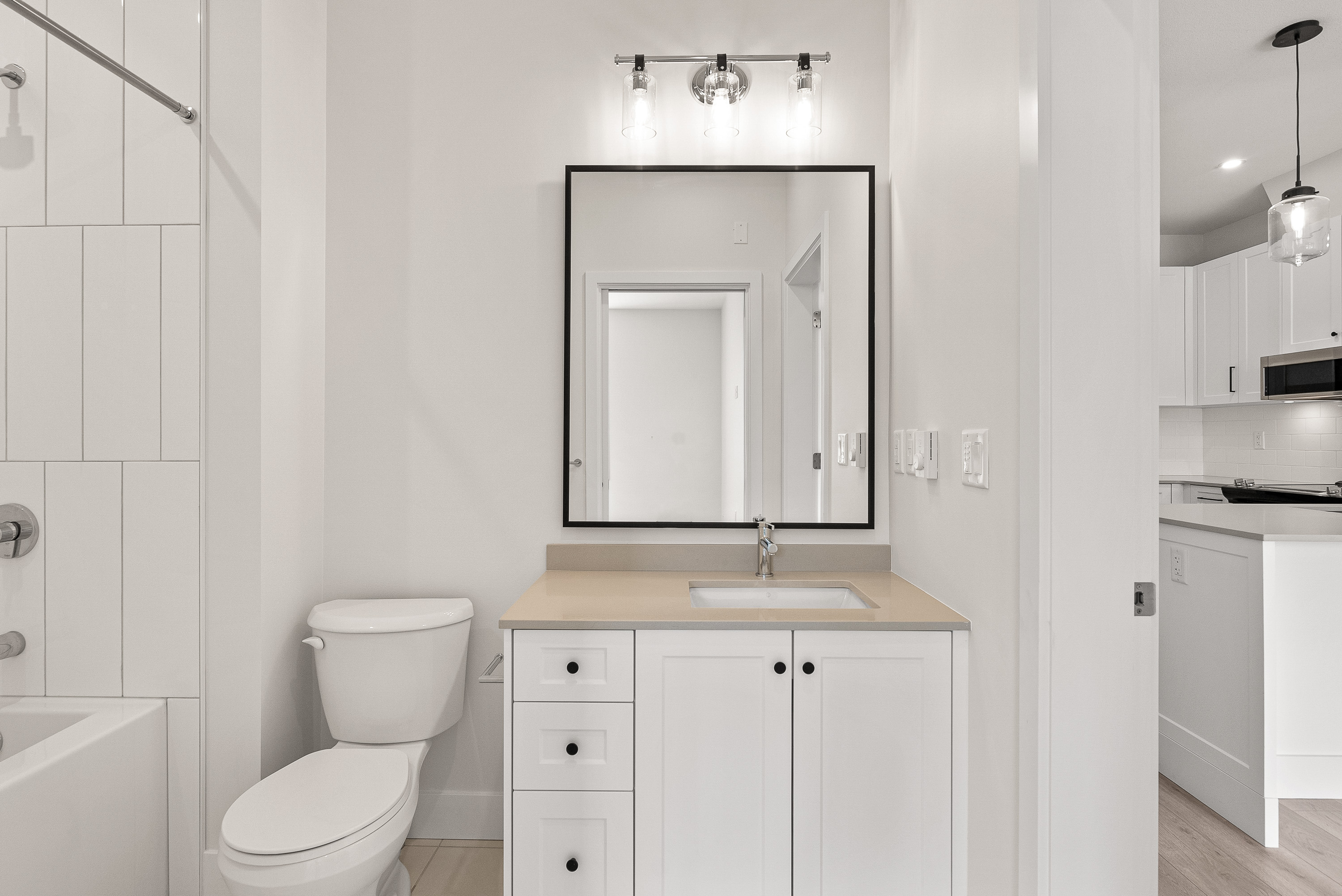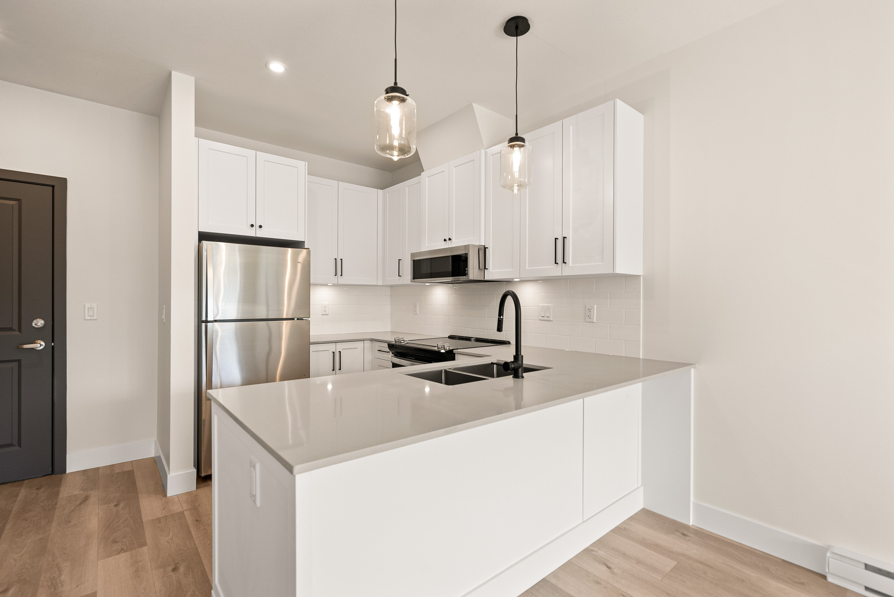 -Laminate counters in the kitchen and bathroom (Select units with Quartz countertops)