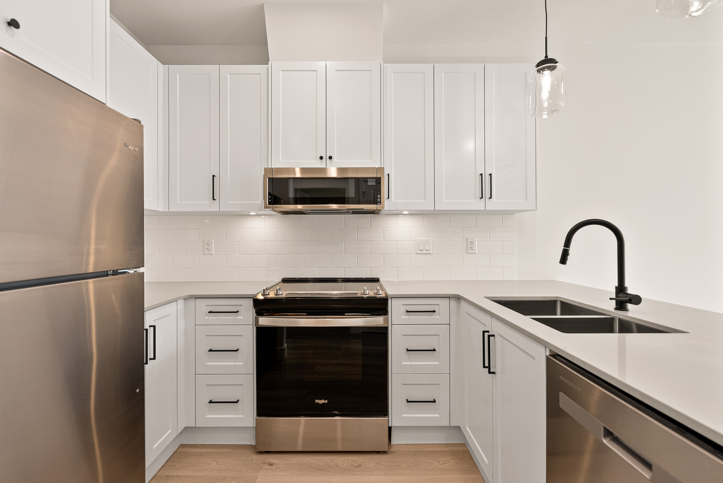 Full-size **Whirlpool appliance package (fridge, stove, microwave, dishwasher)