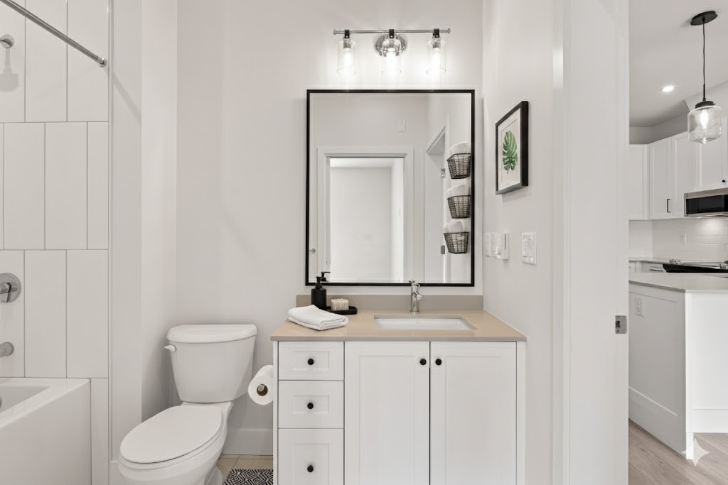Laminate countertops in kitchen and bathroom *(select units feature quartz)